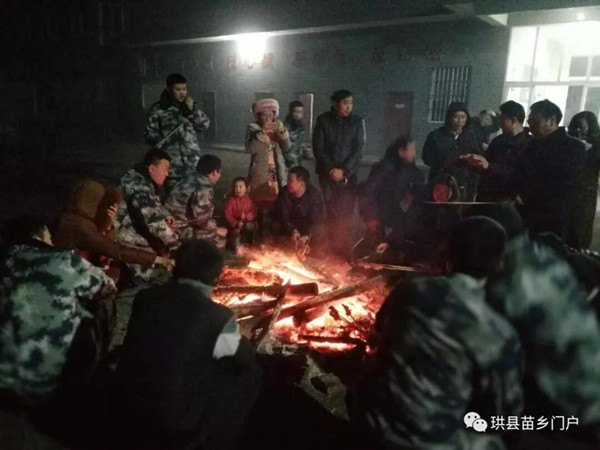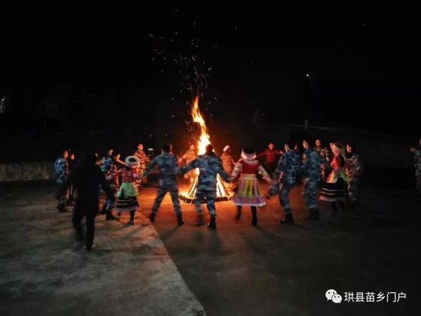 当天晚上,还举行了盛大的篝火晚会,军民手拉手跳起热烈的篝火和芦笙舞,共同欢庆丰收、喜迎新春。
