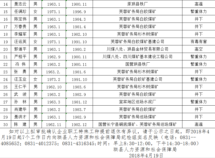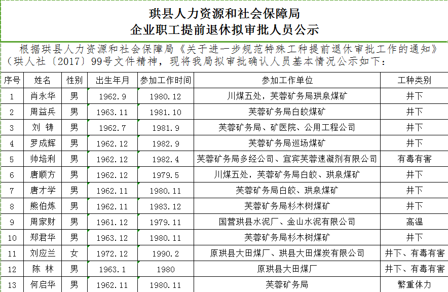 珙县人力资源和社会保障局企业职工提前退休拟审批人员公示